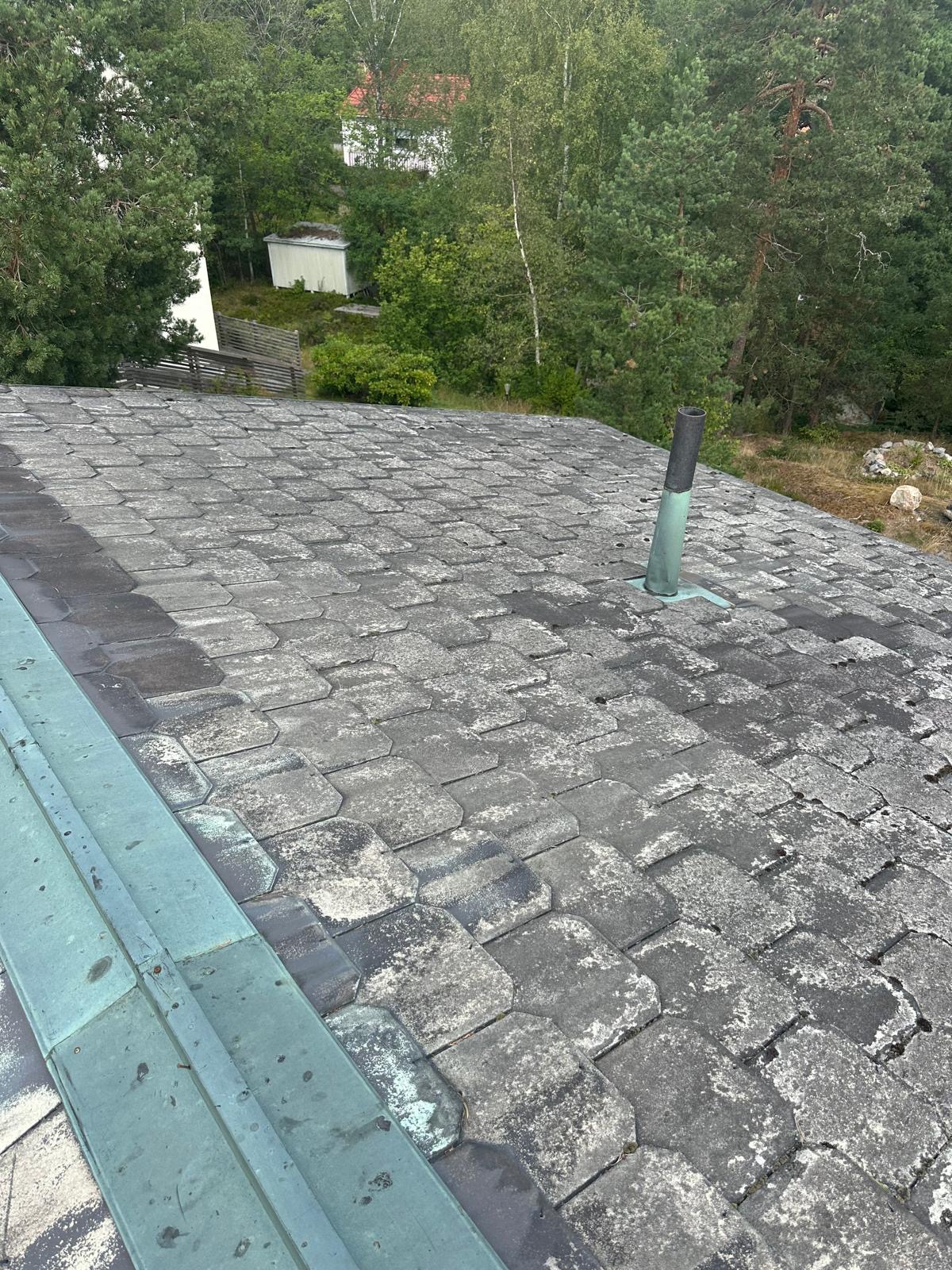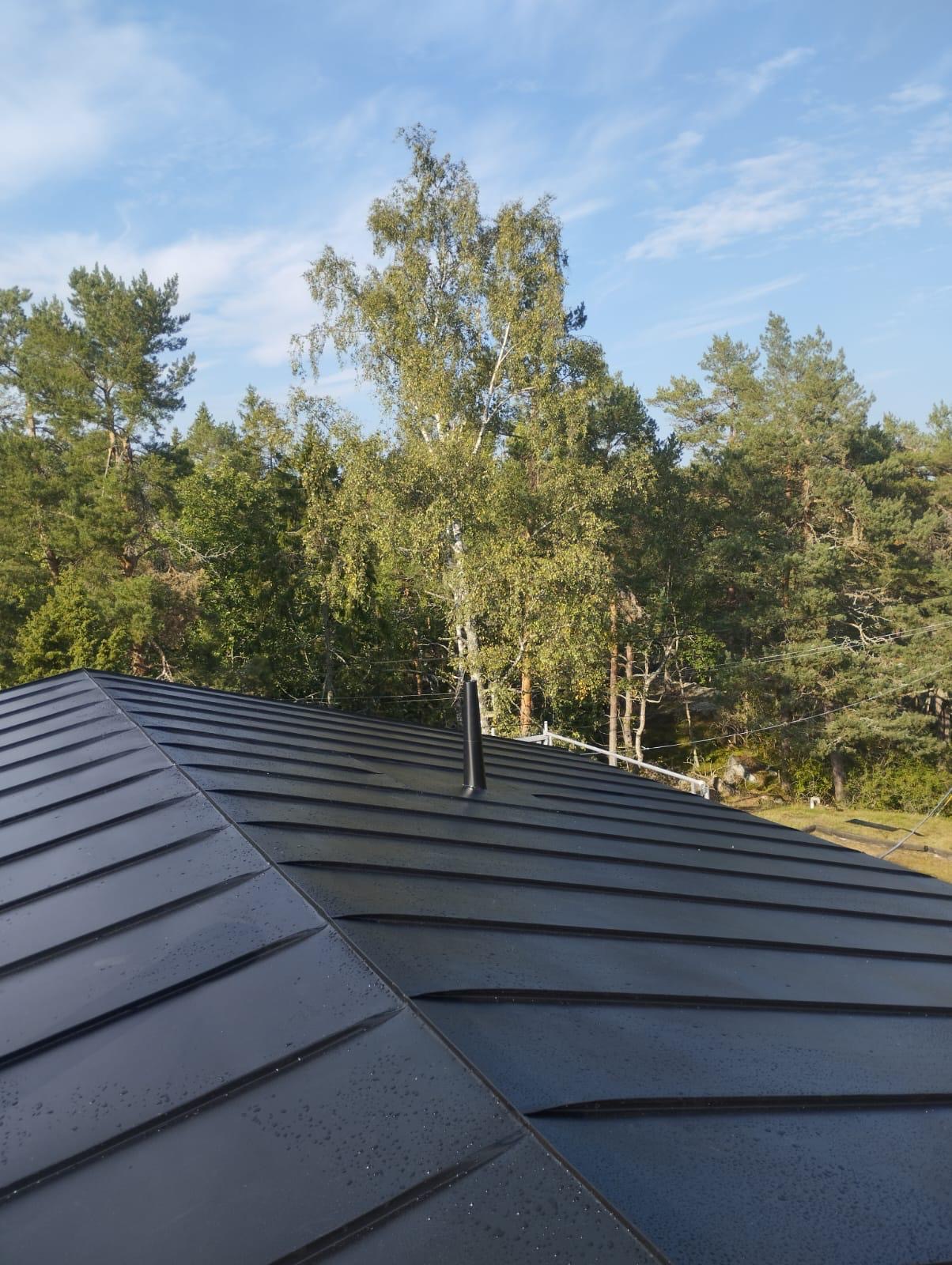Arbetet inleddes med demontering av det gamla taket och kontroll av takkonstruktionen. Vid behov byttes skadad råspont ut innan ny underlagspapp monterades. Därefter utförde våra erfarna plåtslagare monteringen av den falsade plåten med stor precision. Särskild omsorg lades vid detaljer som nock, ränndalar, genomföringar och anslutningar för att säkerställa ett tätt och hållbart slutresultat.