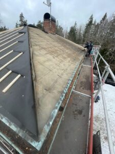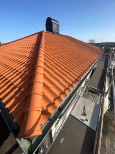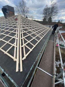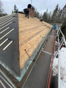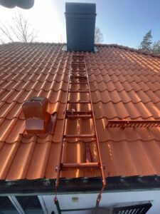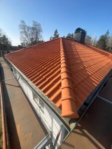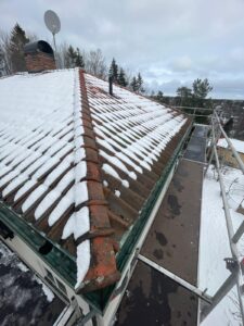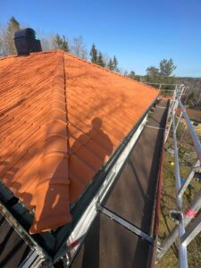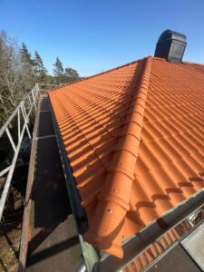 Arbetet inleddes med rivning av det gamla takmaterialet för att komma ner till råsponten och säkerställa konstruktionens skick. Därefter monterades ny underlagspapp – Icopal Flexisteel – som ger ett extra slitstarkt och vädertåligt skydd. Ny läkt (25×48) installerades med precision för att skapa en stabil grund, innan de nya enkupiga tegelpannorna lades med noggrann passform. Arbetet inkluderade även inklädnad av skorstenen samt montering av en ny skorstenshuv för förbättrat skydd och ett enhetligt helhetsintryck.