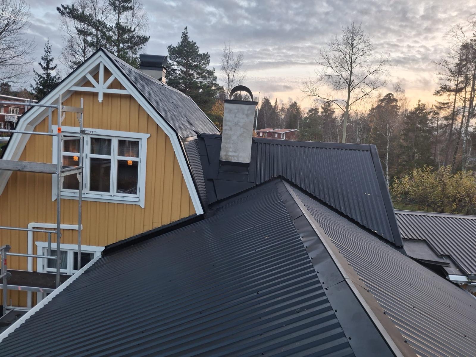 Arbetet påbörjades med demontering av det gamla taktäckningsmaterialet samt kontroll av underlaget. Vid behov byttes skadade delar av råsponten ut innan ny underlagspapp monterades. Därefter installerades TP20 takplåt med precision och korrekt infästning för att säkerställa optimal täthet och stabilitet. Våra erfarna plåtslagare utförde även nödvändiga plåtarbeten kring nock, kanter och genomföringar för ett enhetligt och professionellt slutresultat.